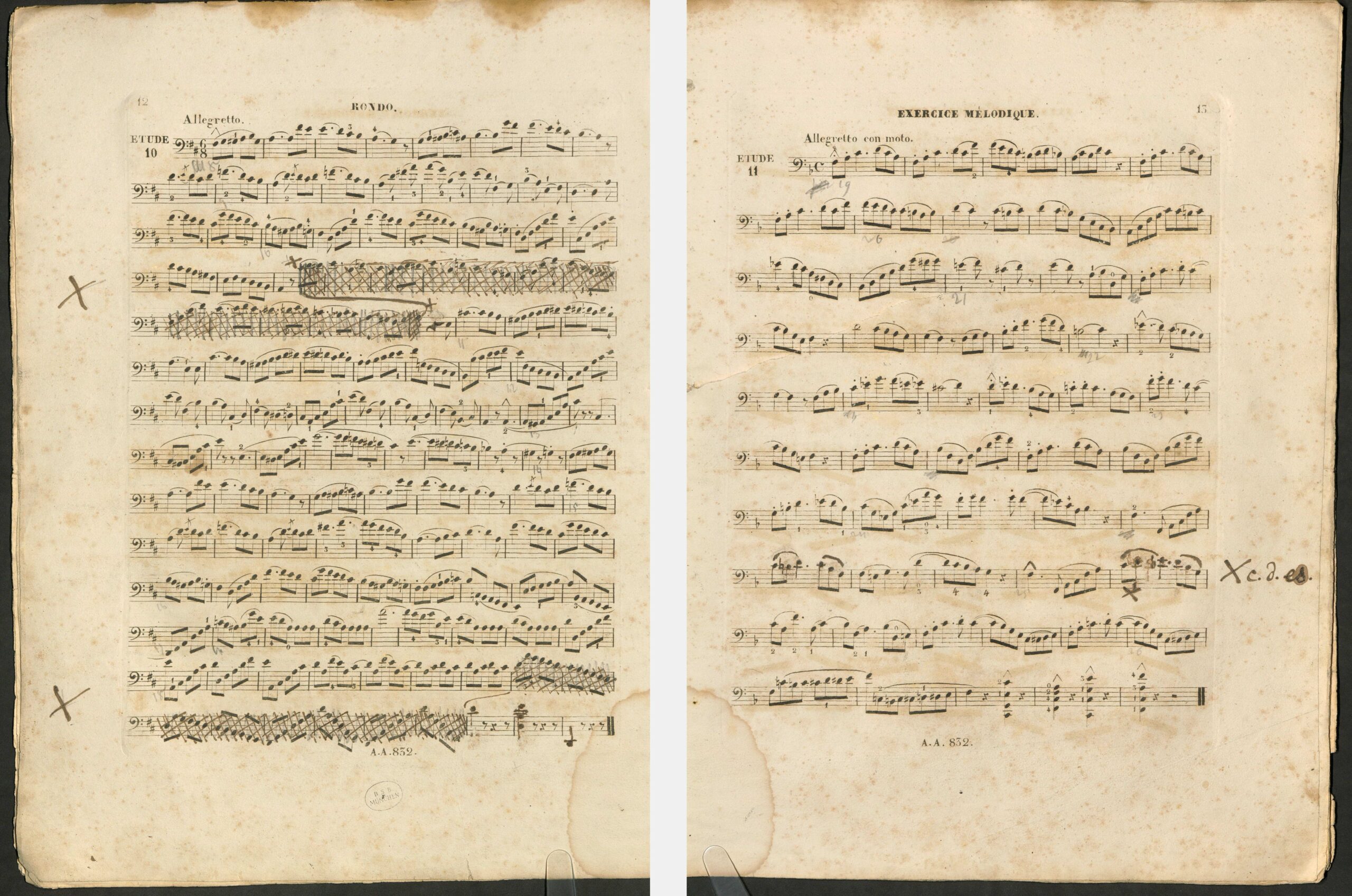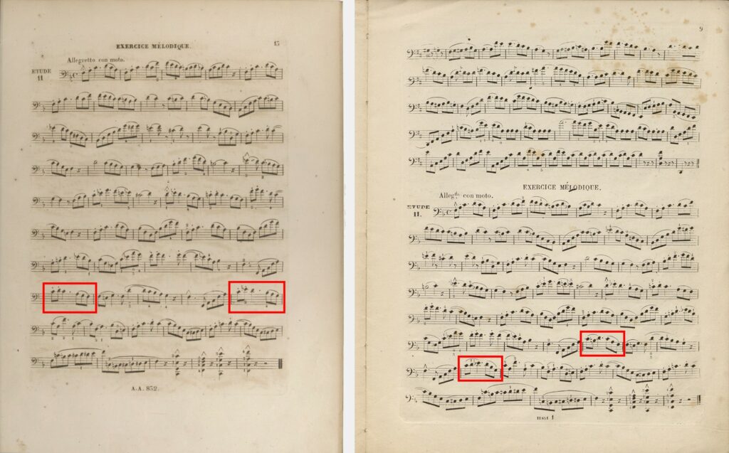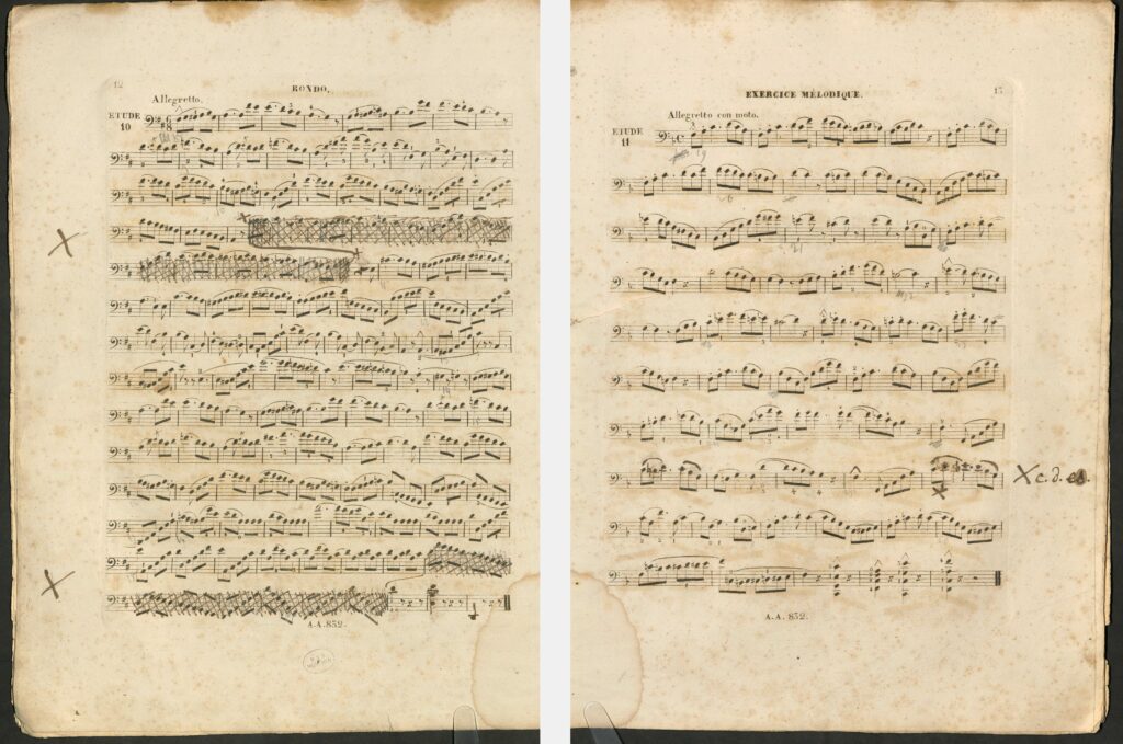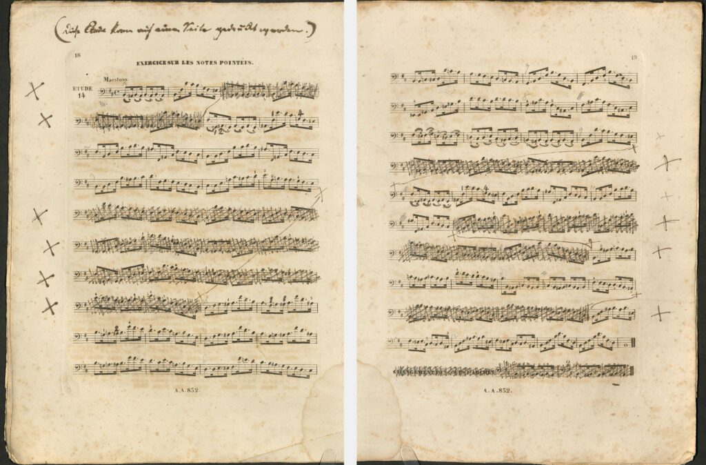 于是,在我们的助理编辑不知疲倦地继续耐心搜索德语版朔特乐谱的同时(最终在法兰克福大学图书馆中寻获!),我来到了巴伐利亚州立图书馆,馆方非常友善地允许我提前查看了那份正准备进行数字化工作的排印底本。我在查看时发现,这份充当底本的刊行本乐谱上的手写记录也涉及到了对练习曲的删节,此前我们只知道这些删节来自贝克编订的更晚近的新版乐谱,且总是被追溯到贝克。期间从法兰克福发来的朔特出版社1853年版乐谱扫描件则证明:这些改动在1853年就已付梓了,因此决不能追溯到贝克身上——后者在10年之后才出生。