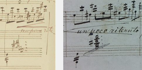 Die Bedeutung dieser vorher nicht bekannten Quelle soll an einem markanten Beispiel veranschaulicht werden. Im Klavierpart findet sich in Takt 496 eine merkwürdige Abweichung in der linken Hand beim Vergleich der Druckausgaben von Partitur und Klavierauszug.
