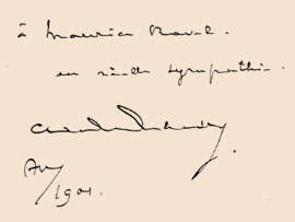 Debussy’s autograph dedication in the Nocturnes full score: à Maurice Ravel, en réelle sympathie. Claude Debussy. Avril 1901.