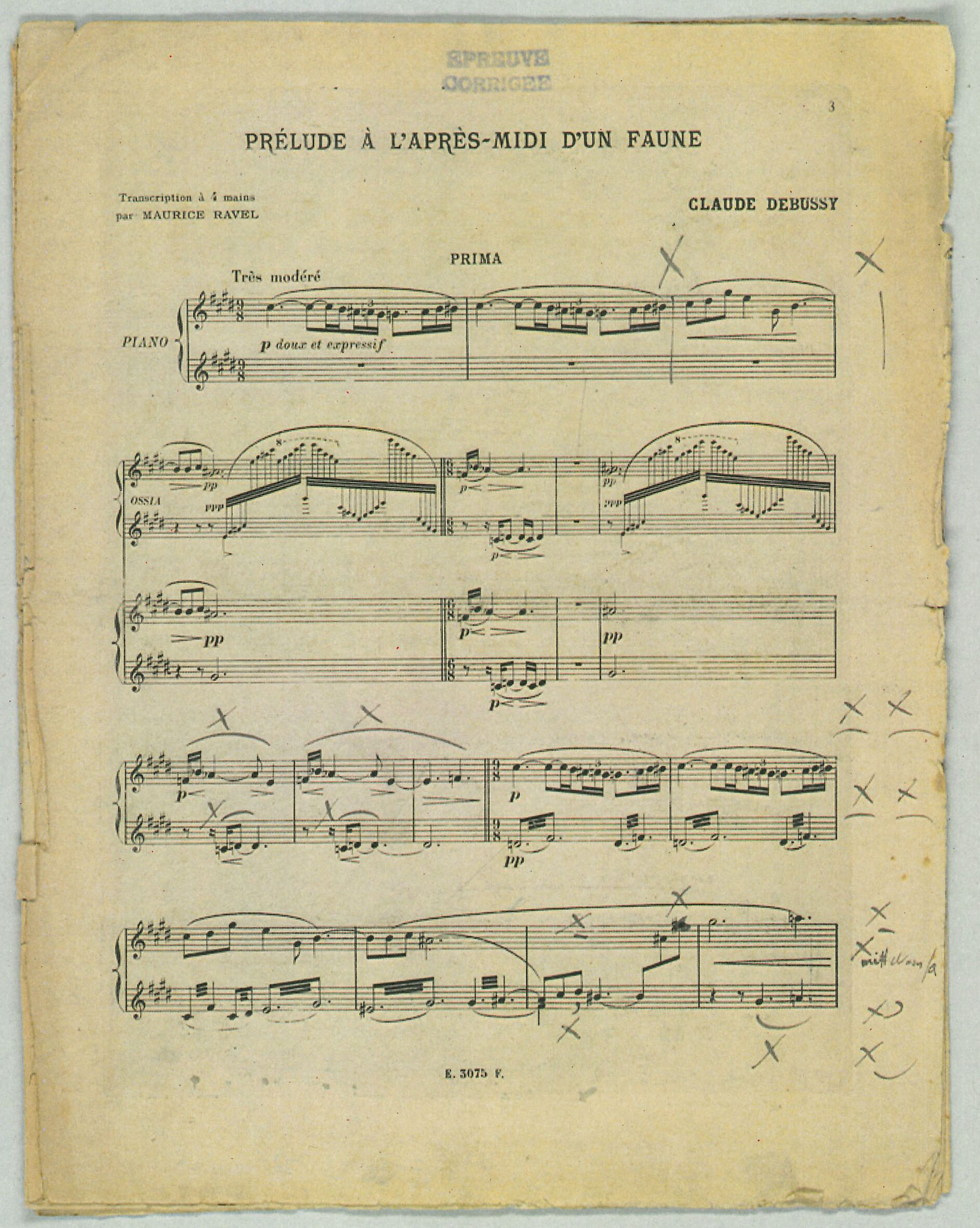 Ravel’s arrangement of Debussy’s Prélude à l’après-midi d’un faune for four-hand piano, first page of the galley proof with Ravel’s corrections (New York, The Morgan Library & Museum)