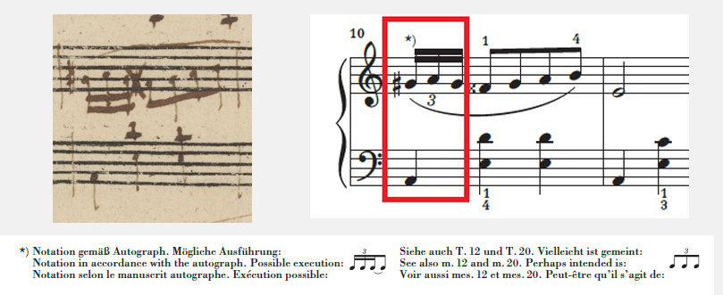 JK: Chopin’s notation of the triplet figure in the second and third phrases is puzzling. It is obviously incorrect from a metrical point of view. Did he intend to write triplet eighth notes, or did the notated triplet sixteenth note imply a non-notated tied eighth note (similar, perhaps, to the grace note figure in measure 12)? Or do the sixteenth-note triplets also tell us something about an intended rapid tempo of the Waltz? Chopin’s ambiguous notation allows for some interpretative freedom on the part of the pianist. And so we have decided to use the autograph notation, with an explanatory footnote.