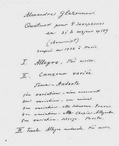 A very interesting detail from this page: Since Glazunov himself assigned the opus number 109 to his saxophone quartet, it is authentic, although the first edition was not published until 23 years after his death. (Unlike Glazunov’s saxophone concerto, composed two years later, but incorrectly assigned, posthumously, also the opus number 109, as the publishing house knew nothing about the still unpublished quartet…)